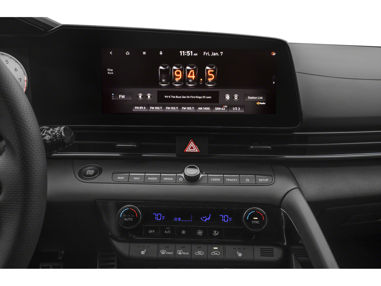 - Radio: Bose AM/FM/HD/SiriusXM Audio System -inc: 8 speakers w/center channel and subwoofer, 10.25" high resolution touchscreen, navigation system, Android Auto and Apple CarPlay, SiriusXM Data Services including NavTraffic, NavWeather and sports and stocks (3-month trial), Bluetooth® hands-free phone system w/dynamic voice recognition, BlueLink Connected Car Services, Aux and USB Input and speed-sensitive automatic volume control