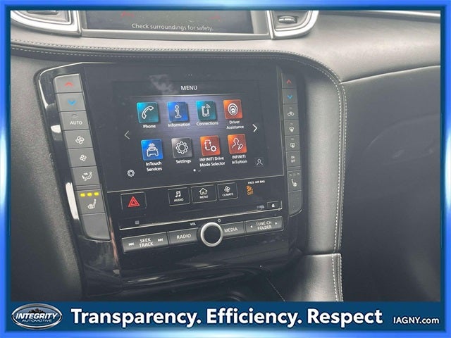 - Radio: AM/FM Audio System -inc: 6 speakers, INFINITI InTouch dual display system w/upper 8" and lower 7" touch screens, wireless Apple CarPlay, Android Auto, HD Radio technology, SiriusXM radio w/advanced audio features and 90-day complimentary trial, INFINITI voice recognition, INFINITI InTouch services, Siri eyes free and Wi-Fi hotspot